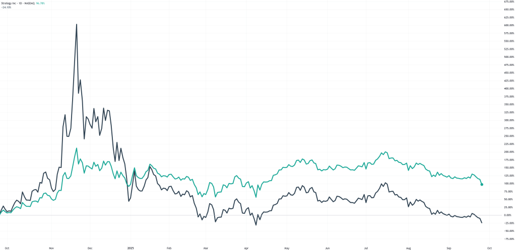 Looking at the 1-year return for MicroStrategy (MSTR:NASDAQ) and Defiance Daily Target 2x Long MSTR ETF (MSTX:NASDAQ). We can see that despite the benchmark asset, MSTR (in teal), being up ~95% over the past year the 2x ETF (in black) is actually down ~25%.