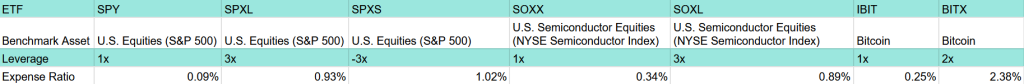 Leveraged ETFs look to leverage the return of a benchmark asset by a multiple normally 2x or 3x. The benchmark assets can be a broad market index like the S&P500, a sector focus like tech,a cryptocurrency like Bitcoin, and more recently single stocks, which is partially why the fund creators love creating leveraged ETFs, the choices are endless. The structure is the same regardless of the benchmark asset but then can be marketed towards various investor groups. The fund creator uses derivatives, whether swaps or futures, to recreate a multiple of the daily return of the benchmark.