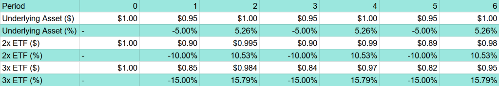 For example, if the benchmark asset falls from $1.00 to $0.95 or declining by 5%, a 3x ETF will fall to $0.85 or declining by 15%. If the benchmark asset the following day rises back to $1.00 or increases by 5.26%, the leverage ETF will increase by 15.79% to $0.984. So, despite the benchmark asset being the same price after the 2 days the 3x leveraged ETF fell by ~1.6%.