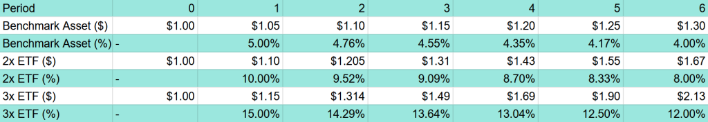 In this example the benchmark asset increased by 30% over the 6 periods, whereas the 2x ETF increased by 67% and the 3x by 113%, above the 60% and 90% return that would be given by a non-resetting 2x and 3x leverage.