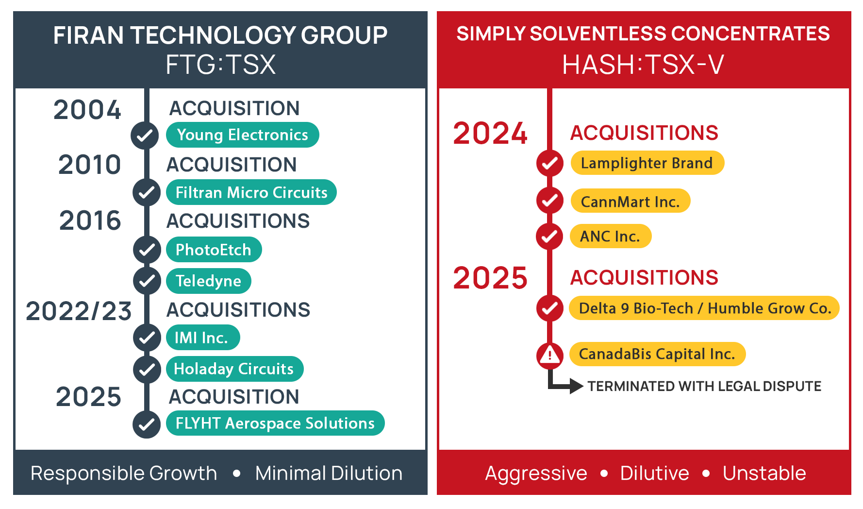Synopsis: Because I feel it valuable to learn our lessons from our portfolio versus a textbook, this article juxtaposes the responsible acquisition strategy of Firan Technology Group Corporation (TSX: FTG) with the more recent aggressive, dilutive approach of Simply Solventless Concentrates Ltd. (TSX-V: HASH), illustrating how their respective paths have impacted shareholder returns. We have interviewed management at both small cap companies. One we have recommended and owned for a decade, the other we took a hard pass on.