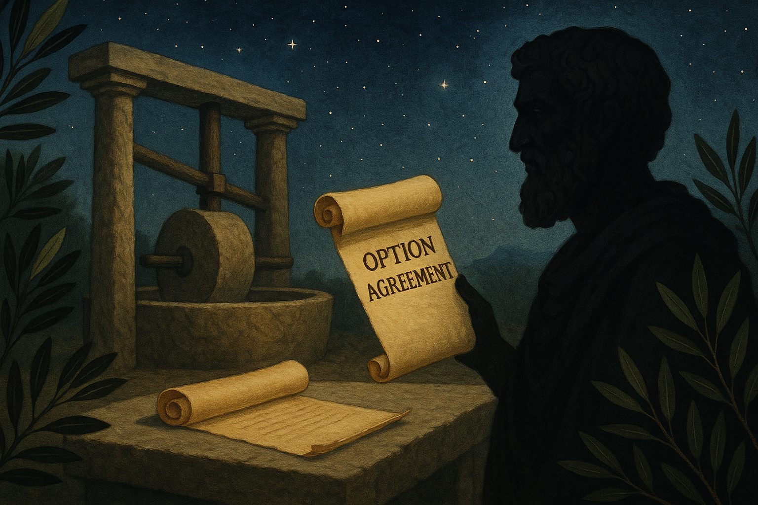 The first option trade was accounted through Aristotle, who related a story of the Greek philosopher, Thales – the founder of natural philosophy – who profited from an option-type agreement around the 6th century B.C. Thales had forecasted that the next olive harvest would be exceptionally good and placed a deposit on the local olive presses, securing him the right but not the obligation to rent the presses at the then relatively low rate (entering into a call option). When the harvest proved to be bountiful, boosting the demand and rental prices of presses, Thales exercised his right to rent the presses at the lower pre-determined rate and charged the higher market price for their use, generating a profit.