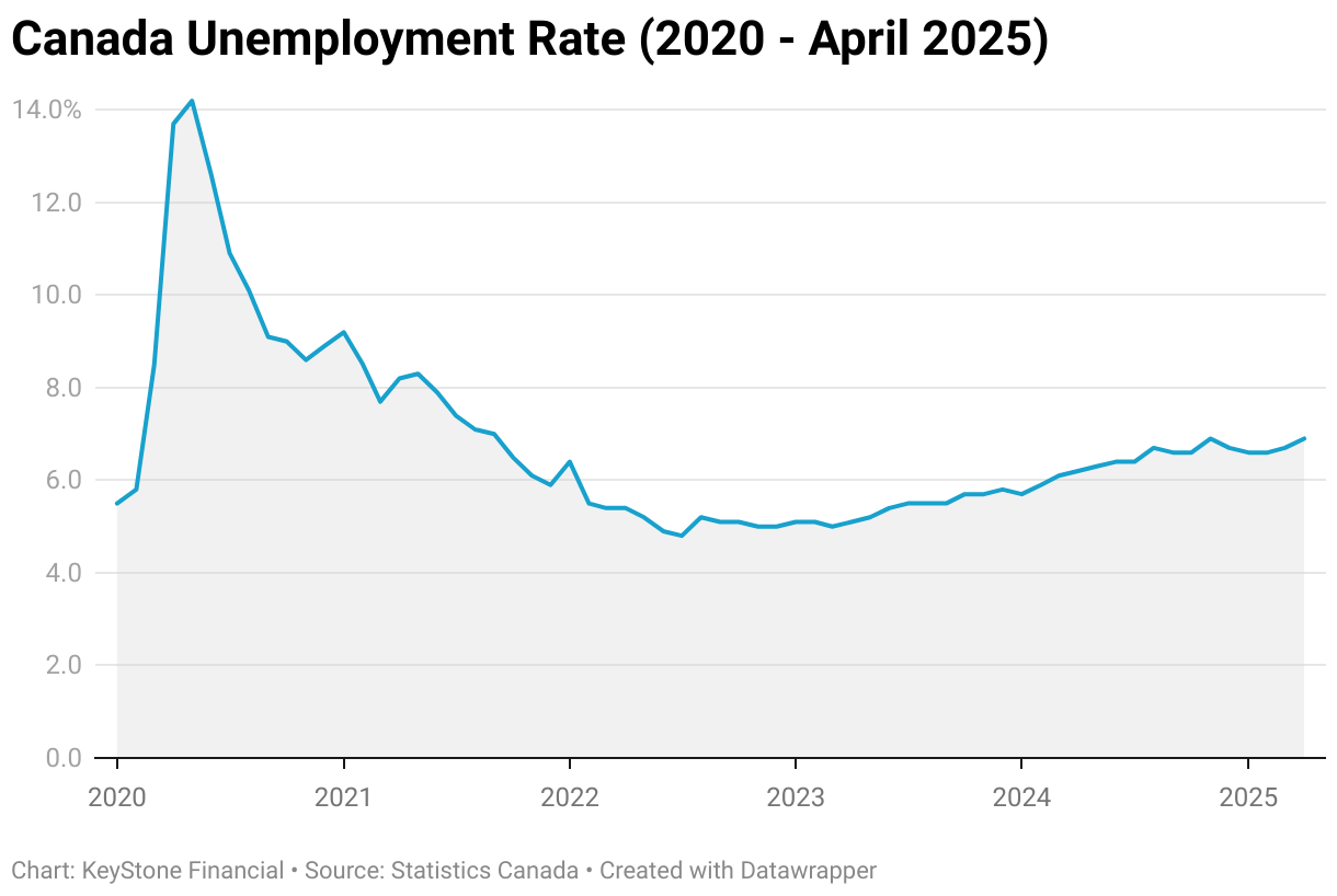 Canada has seen an upward trend in unemployment since bottoming out in 2022. April 2025 unemployment came in at 6.9%, a monthly sequential increase of 0.2%. A weakening labour market creates a disinflationary effect as household spending decreases as people are unable to find work. Unemployment and Inflation being at odds create a volatile environment for interest rate expectations, as both factors are impacted by interest rate changes. If a central bank increases interest rates to tame inflation, the economy will slow, resulting in increased unemployment. Ultimately, this makes the job of a central bank, like the Bank of Canada, more difficult.
