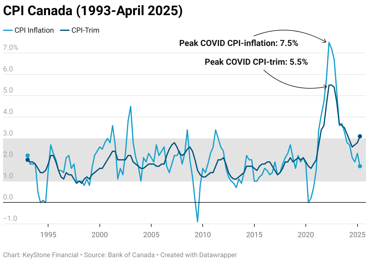 While most news sources will quote total CPI or Headline CPI/Inflation, the Bank of Canada focuses on core inflation. Core inflation removes the impact of more volatile aspects of inflation. CPI-trim is one measure of core inflation, and it excludes the top and bottom 20% monthly weighted price variations. Typically, what gets trimmed are various food prices and energy prices. The Bank of Canada and other central banks commonly rely on core inflation because they can’t control aspects of strong shifts in the supply and demand of products. For instance, a surge of bird flu impacting egg production cannot be solved by monetary policy.