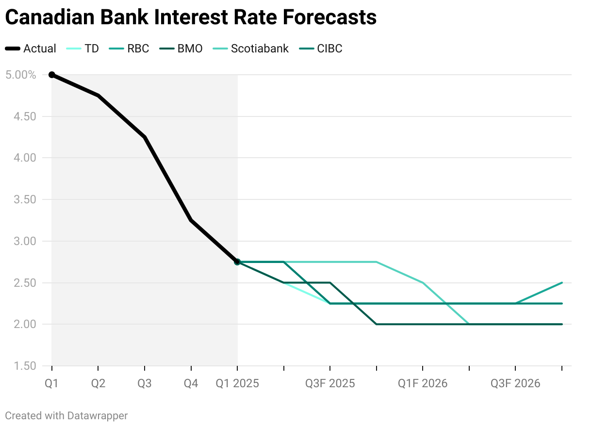 Canada’s policy rate currently sits at 2.75%, a sharp decline from 5.00% just over a year ago.