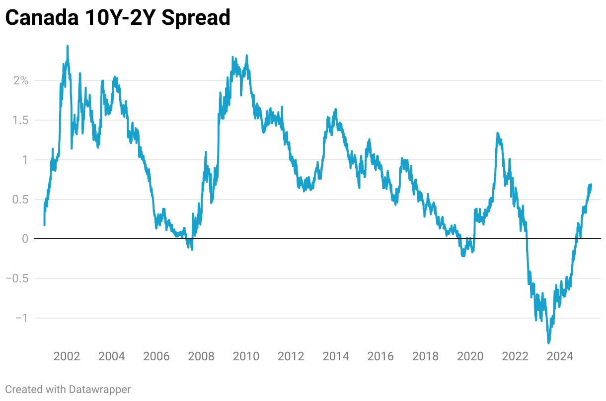 A bear market steepener is when the spread between the short end of the curve and the long end rises. The dynamic in Canada over the past year has caused a bear steepener to occur as the yield curve uninverted. The yield spread between the 10-year and 2-year bonds has substantially increased over the past year by 126 basis points (1.26%). While the yield curve is now in its normal state of an upward sloping curve, the shift makes long-term financing more expensive not only for the Canadian governments but also for any entity that borrows at long-term rates.