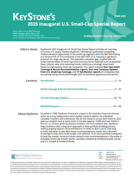 KeyStone’s 2025 Inaugural U.S. Small-Cap Special Report provides an overview of current U.S. equity market valuations, identifying a potentially compelling relative valuation opportunity in the small-cap segment, with the S&P 600 trading at a forward P/E of 15.8 compared to the S&P 500’s 21.6, implying a significant premium for large-cap stocks. This persistent valuation gap, coupled with the under-owned status of small caps and macroeconomic tailwinds such as potential lower interest rates and reshoring trends, reinforces a strategic investment thesis for high-quality small-cap companies. The report includes four new Initial Coverage & Recent Recommendation reports, four new Company Updates from U.S. Small-Cap Coverage, and 11 full Monitor reports on companies that are actively being monitored through 2025 for potential opportune entry points.