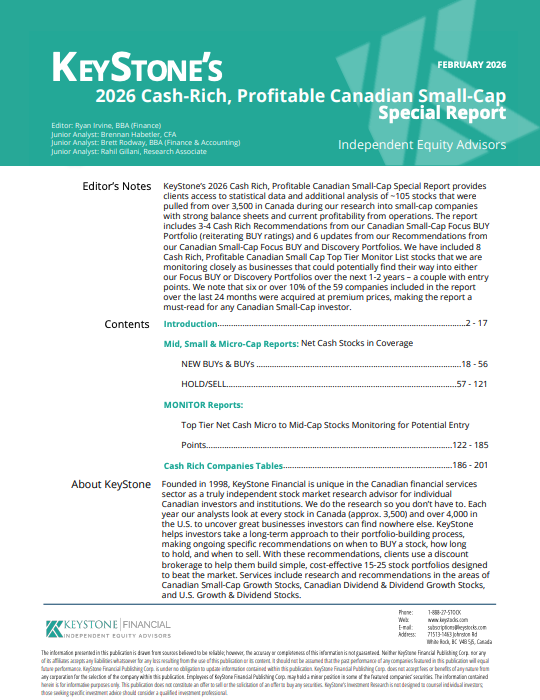 KeyStone’s 2026 Cash Rich, Profitable Canadian Small-Cap Special Report provides clients access to statistical data and additional analysis of ~105 stocks that were pulled from over 3,500 in Canada during our research into small-cap companies with strong balance sheets and current profitability from operations. The report includes 3-4 Cash Rich Recommendations from our Canadian Small-Cap Focus BUY Portfolio (reiterating BUY ratings) and 6 updates from our Recommendations from our Canadian Small-Cap Focus BUY and Discovery Portfolios. We have included 8 Cash Rich, Profitable Canadian Small Cap Top Tier Monitor List stocks that we are monitoring closely as businesses that could potentially find their way into either our Focus BUY or Discovery Portfolios over the next 1-2 years – a couple with entry points. We note that six or over 10% of the 59 companies included in the report over the last 24 months were acquired at premium prices, making the report a must-read for any Canadian Small-Cap investor